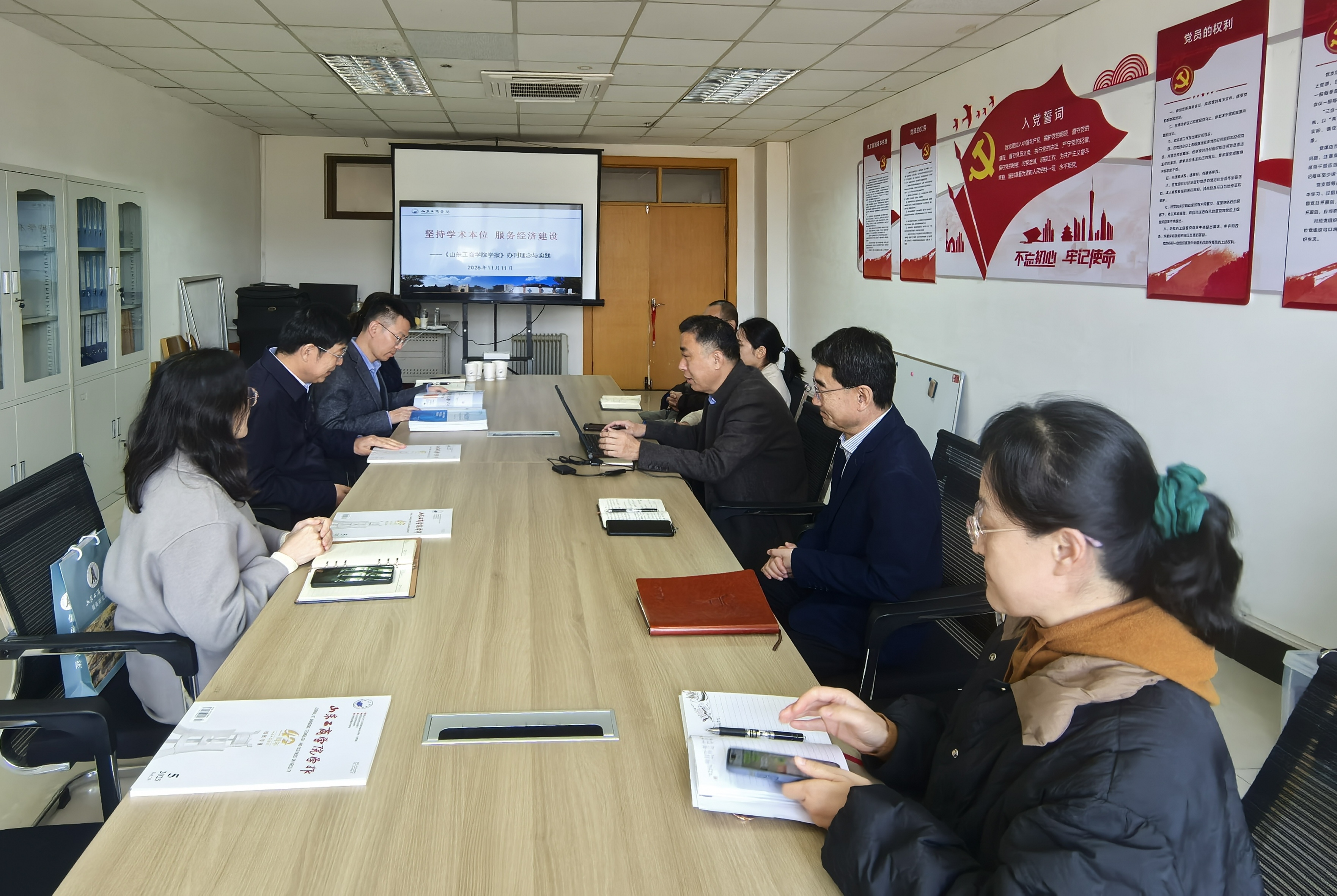 11月11日上午,滨州医学院期刊部主任杨成一行4人来访,学报编辑部主任、主编刘庆东主持座谈交流会。刘庆东对杨成一行表示热烈欢迎,并以“坚持学术本位 服务经济建设——《山东工商学院学报》办刊理念与实践”为题,向客人介绍了我校学报的办刊历史、基本情况和主要做法。双方围绕如何促进学报高质量发展、更好服务教学科研和特色建设进行了深入交流。随后,刘庆东陪同客人参观了学报编辑部陈列室。