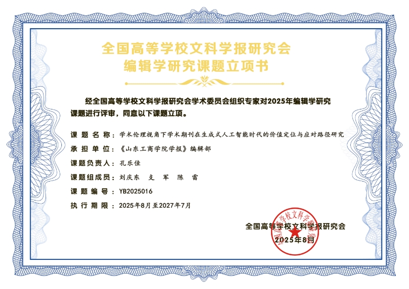 近日,全国高等学校文科学报研究会公布了2025年度编辑学研究项目审批立项情况。经过全国高等学校文科学报研究会学术工作委员会各位专家和学术委员严肃认真的评审,共立项270项,其中重点项目21项、一般项目65项、培育项目(自筹经费)184项。《山东工商学院学报》编辑部孔乐佳老师主持申报的“学术伦理视角下学术期刊在生成式人工智能时代的价值定位与应对路径研究”,获批全国高校文科学报研究会2025年度编辑学研究一般项目(编号:YB2025016),为86项有资项目之一。此次立项,将进一步提升编辑业务技能,提高学术研究水平,促进学报高质量发展。